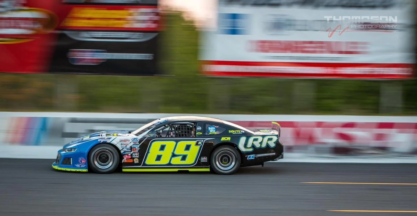 Race car number 89 speeding on a racetrack with blurred background.